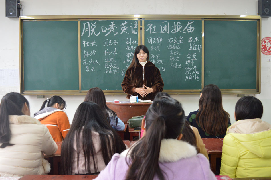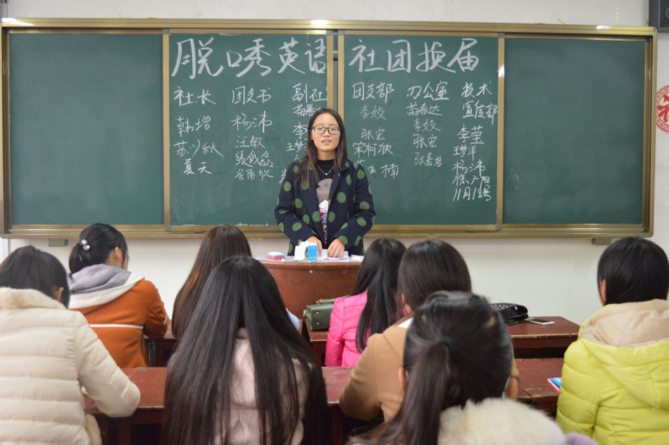 11月18日中午,球盟会英语脱口秀社团在人文楼104教室进行2015-2016学年换届,社长魏晓莉携本社全体成员参与,大会由副社长夏天主持。