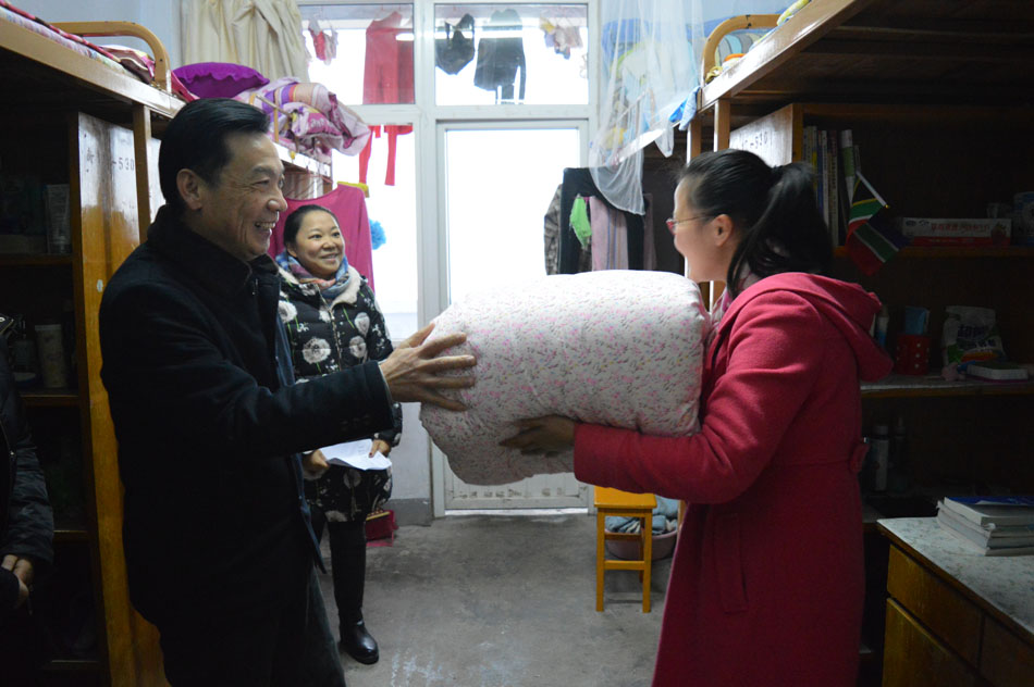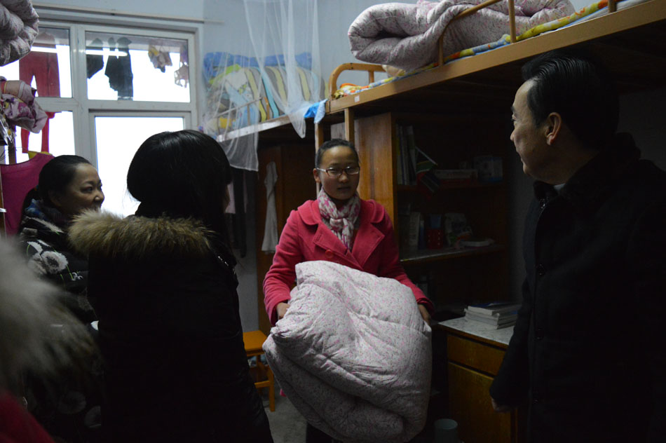 为响应公司号召,12月11日下午,公司党委书记周学红,党委副书记陈铭和各年级专职辅导员一同前往员工宿舍为家庭经济困难员工发放过冬棉被,送去公司温暖。