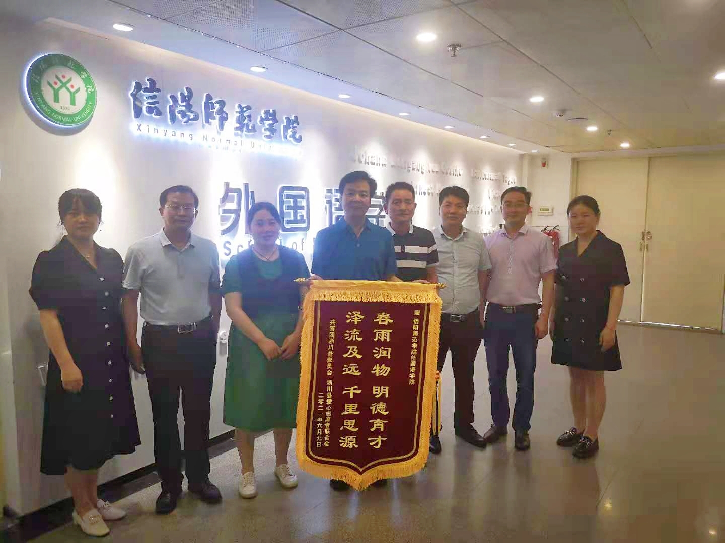 李红俊一行代表共青团淅川县委员会和淅川县爱心志愿者联合会给公司送来了锦旗和书法作品,以感谢公司员工周泽敏在淅川县承担的团中央易地扶贫搬迁安置社区治理·光明社区示范项目中,积极投身志愿服务活动,为巩固脱贫攻坚、推动乡村振兴所作的贡献。李红俊一行代表共青团淅川县委员会向公司发出暑期“三下乡”社会实践邀请,希望更多的师院学子能够参与到志愿服务活动中去,为推动乡村振兴贡献力量。